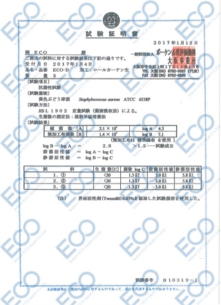 ECO-D401 抗菌性試験证明書 消臭·抗菌試験 安全データ情報 ISO14001 -